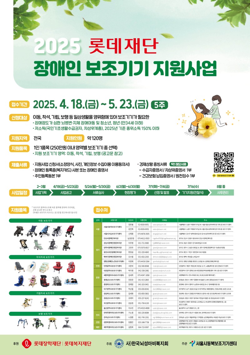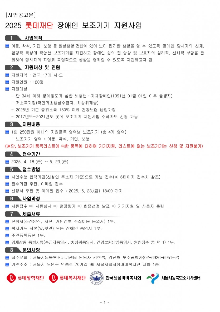 [안내] 서울시동북보조기기센터 2025 롯데재단 장애인 보조기기 지원사업 작성자작성자 이유정 조회조회795회 작성일작성일25-04-28 14:26 본문 첨부 파일 2025롯데재단지원사업_공고문.pdf (630.0K) 첨부 파일 2025롯데재단지원사업신청서양식.hwpx (70.6K) 원본 출처 : <동북> 2025 롯데재단 장애인 보조기기 지원사업 안내 > 공지사항 | 서울시보조기기센터 목록목록 이전글[안내] 2025년 정보통신보조기기 보급사업 25.05.26 다음글[안내] 2025 장애인의류리폼지원캠페인 접수 안내 25.04.28