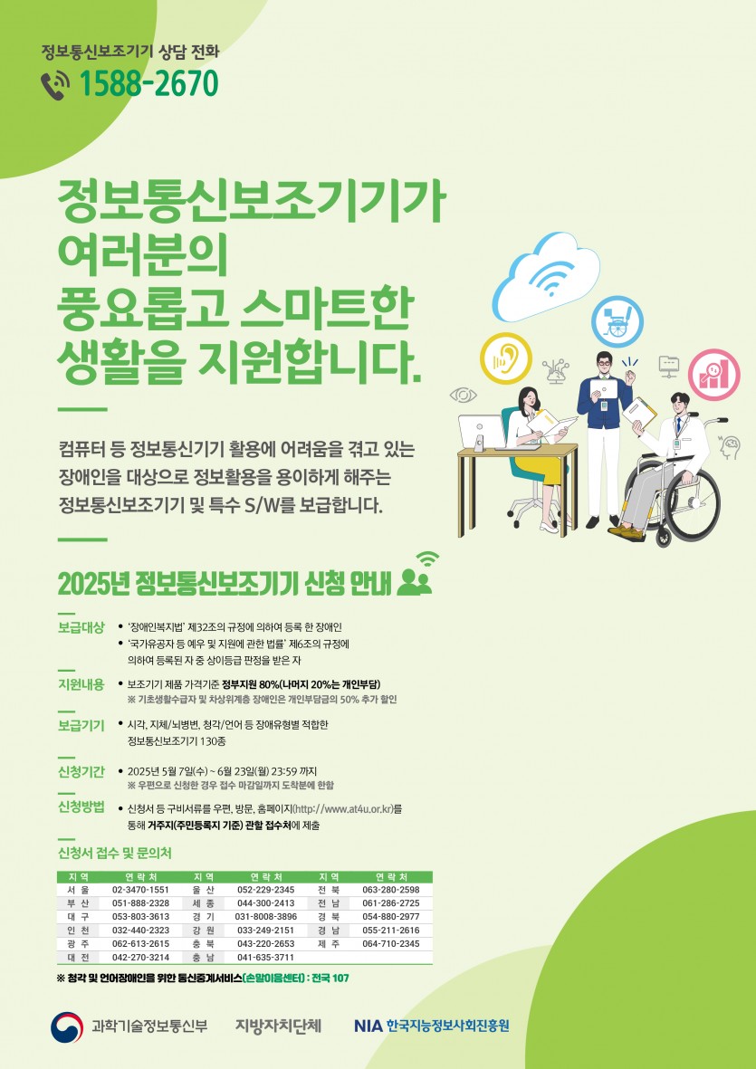 [안내] 정보통신보조기기 “데프 아코이호출기, 네비게이션신호기세트, 소리알리미” 보급 작성자작성자 이유정 조회조회676회 작성일작성일25-06-16 09:54 본문 첨부 파일 정보통신보조기기_보급사업_신청서_2025.hwp (116.0K) 첨부 파일 활용계획서 예시_데프아코이호출기.hwp (67.5K) 자세한 내용은 아래 홈페이지를 참고해주세요.https://www.at4u.or.kr/index.asp 목록목록 이전글[안내] 식중독 예방 6대 수칙 25.06.16 다음글[안내] 체험형XR콘텐츠기술개발사업 테스트베드 참가자 모집 25.06.10