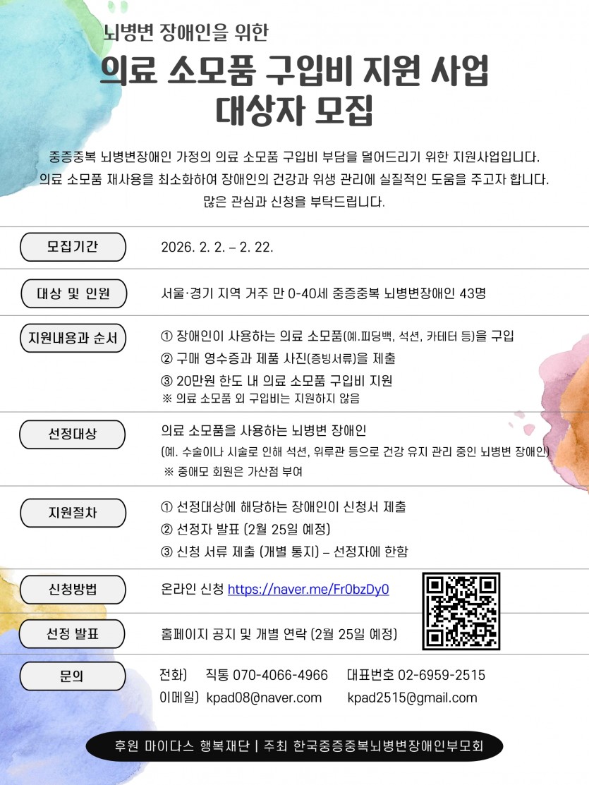 라. 지원내용: 의료 소모품 구입비 지원 (1인 20만원 한도 이내) 마. 지원방법: 네이버 온라인 폼 신청서 접수