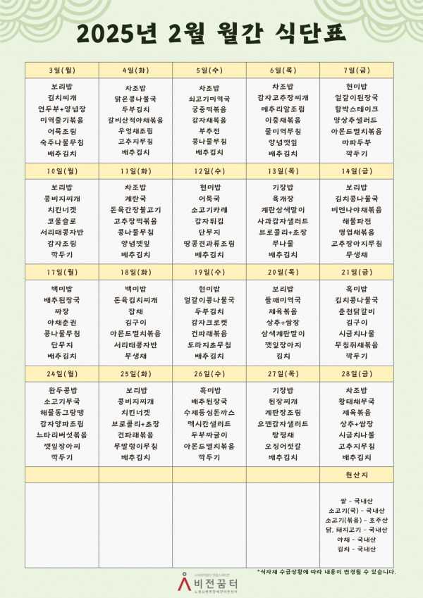 25년 2월 월간 식단표 작성자작성자 이유정 조회조회1,108회 작성일작성일25-01-31 18:05 본문 목록목록 이전글25년 3월 월간 식단표 25.02.28 다음글25년 1월 월간 식단표 25.01.02