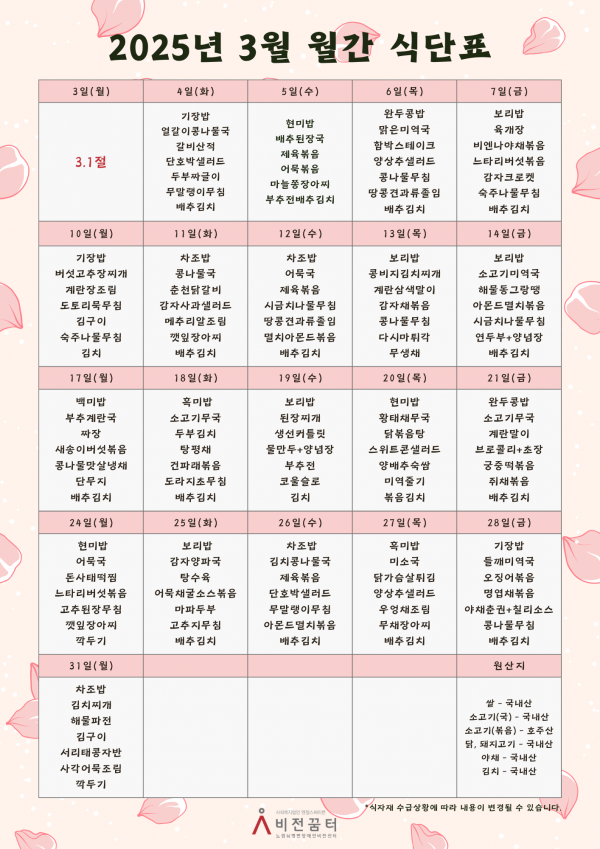 25년 3월 월간 식단표 작성자작성자 이유정 조회조회956회 작성일작성일25-02-28 18:00 본문 목록목록 이전글25년 4월 월간 식단표 25.04.03 다음글25년 2월 월간 식단표 25.01.31