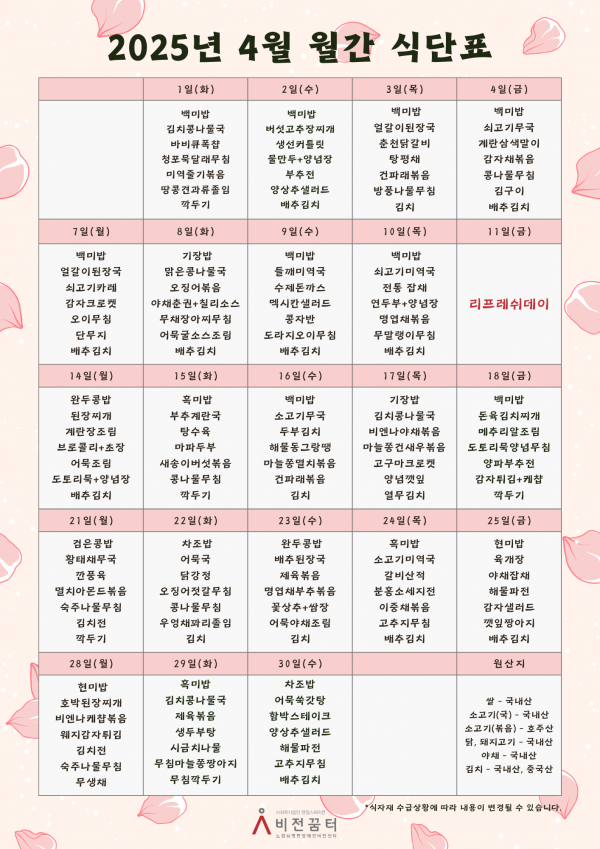 25년 4월 월간 식단표 작성자작성자 이유정 조회조회801회 작성일작성일25-04-03 11:43 본문 목록목록 이전글25년 5월 월간 식단표 25.04.30 다음글25년 3월 월간 식단표 25.02.28