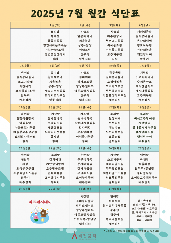 25년 7월 월간 식단표 작성자작성자 이유정 조회조회519회 작성일작성일25-06-30 11:06 본문 목록목록 이전글25년 8월 월간 식단표 25.07.31 다음글25년 6월 월간 식단표 25.06.02