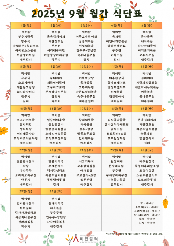 25년 9월 월간 식단표 작성자작성자 이유정 조회조회357회 작성일작성일25-09-02 12:29 본문 목록목록 이전글25년 10월 월간 식단표 25.09.30 다음글25년 8월 월간 식단표 25.07.31