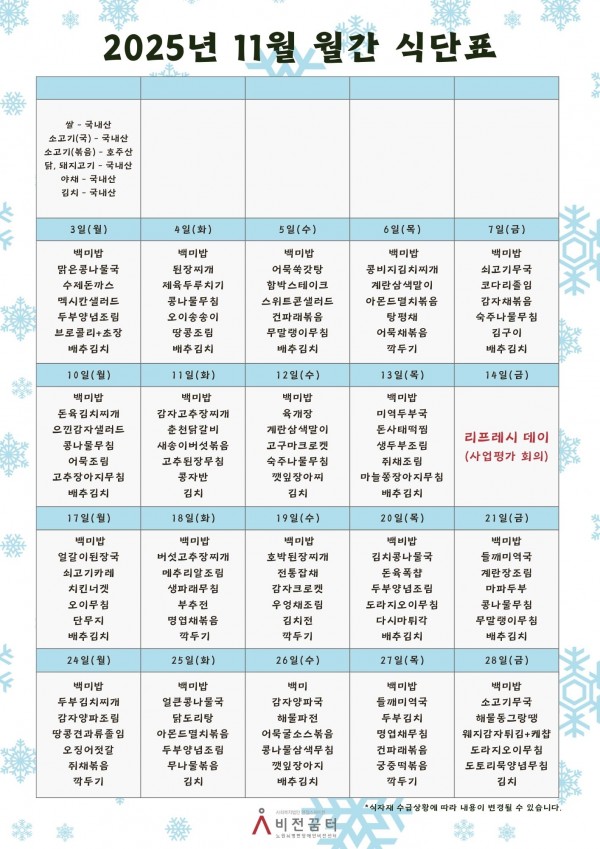 25년 11월 월간 식단표 작성자작성자 이유정 조회조회78회 작성일작성일26-01-02 12:51 본문 목록목록 이전글25년 12월 월간 식단표 26.01.02 다음글25년 10월 월간 식단표 25.09.30