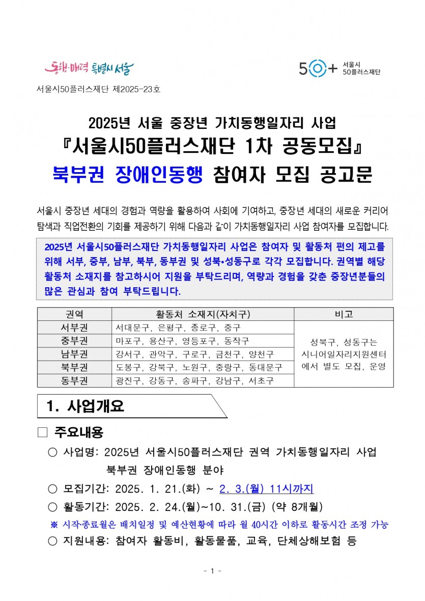 [안내] 2025년 서울시50플러스재단 권역 가치동행일자리 사업(북부권) 장애인동행(1차 공동모집) 작성자작성자 이유정 조회조회992회 작성일작성일25-01-21 11:29 본문 원본 출처: https://50plus.or.kr/appView.do?ANN_NO=1310&setPageIndex=1많은 관심과 참여 부탁드립니다~! 목록목록 이전글[교육] 의사소통 서포터 양성 교육 신청 25.02.12 다음글[안내] 음악활동 프로그램 강사 모집_하계장애인주간활동센터 25.01.17