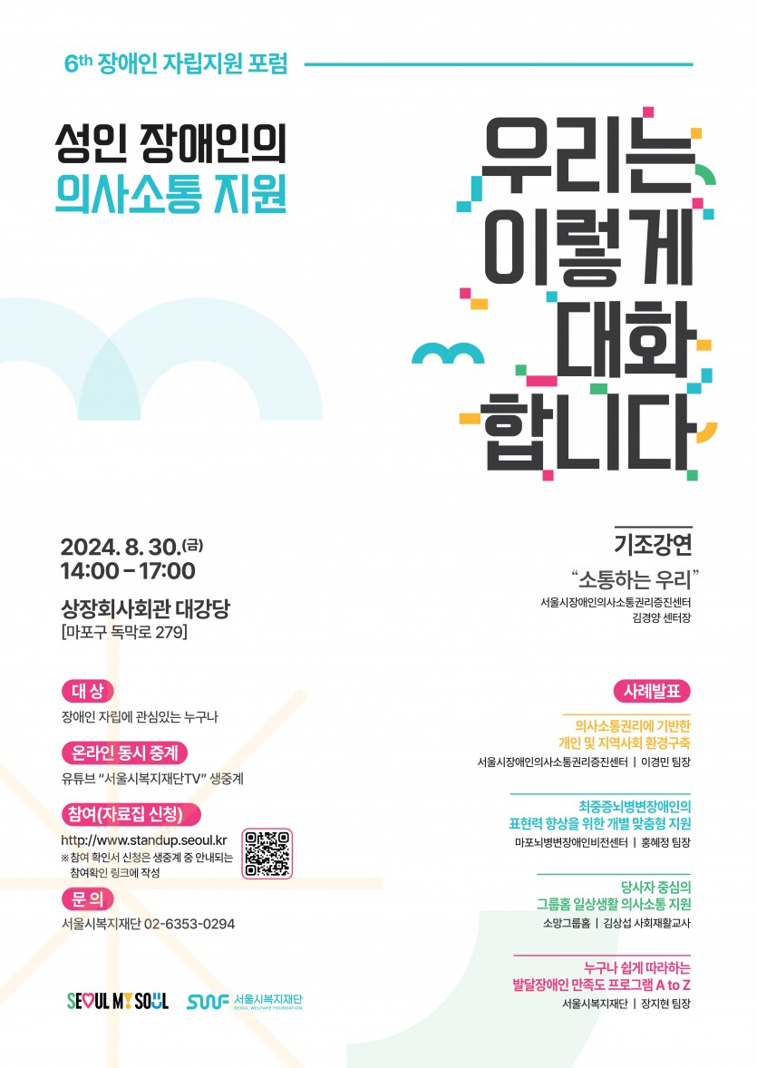 2024년 제 6차 장애인자립지원포럼 참여 신청 안내 작성자작성자 이유정 조회조회1,264회 작성일작성일24-08-12 15:58 본문 많은 관심과 참여 부탁드립니다~ 목록목록 이전글내주변 민방위대피소 찾기 24.08.19 다음글2024년 장애인식개선교육 콘텐츠(동영상) 공모전 안내 24.08.12