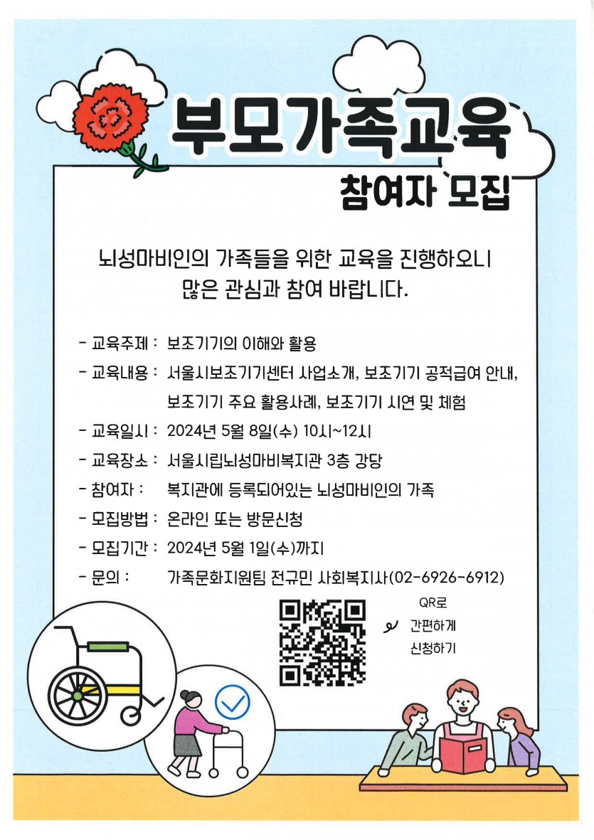 2024 부모교육 참여자 모집 홍보 요청_서울시립뇌성마비복지관 작성자작성자 이유정 조회조회1,406회 작성일작성일24-04-26 11:07 본문 신청링크 : https://forms.gle/kYw1oPeMVwQsT15V6 많은 참여 부탁드립니다. 목록목록 이전글2024년 제5차 장애인자립지원포럼 개최 24.05.10 다음글2024년 평생학습활성화 프로그램 이용인 모집_도봉장애인종합복지관 24.04.22