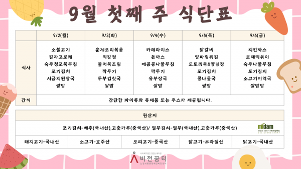 9월 첫째 주 식단표 작성자작성자 이유정 조회조회1,378회 작성일작성일24-08-30 17:25 본문 9월 첫째주 식단표입니다. 목록목록 이전글9월 둘째 주 식단표 24.09.04 다음글8월 다섯째 주 식단표 24.08.21