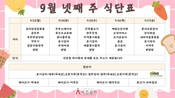 9월 넷째 주 식단표 작성자작성자 이유정 조회조회1,350회 작성일작성일24-09-23 09:31 본문 9월 넷째 주 식단표입니다. 목록목록 이전글10월 첫째 주 식단표 24.09.27 다음글9월 셋째 주 식단표 24.09.10