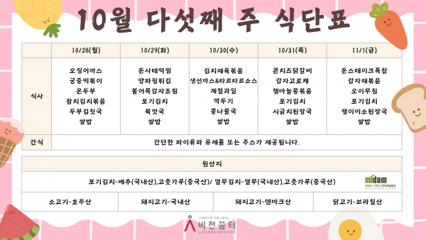 10월 다섯째 주 식단표 작성자작성자 이유정 조회조회1,306회 작성일작성일24-10-25 15:48 본문 10월 다섯째 주 식단표입니다. 목록목록 이전글11월 첫째 주 식단표 24.11.01 다음글10월 넷째 주 식단표 24.10.16