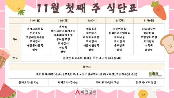 11월 첫째 주 식단표 작성자작성자 이유정 조회조회1,296회 작성일작성일24-11-01 14:57 본문 11월 첫째 주 식단표입니다. 목록목록 이전글11월 둘째 주 식단표 24.11.07 다음글10월 다섯째 주 식단표 24.10.25