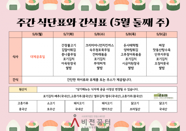 - 이전글주간 식단표와 간식표(5월 셋째 주) 24.05.09