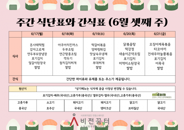 - 다음글주간 식단표와 간식표(6월 둘째 주) 24.06.05