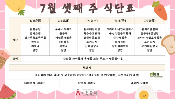 7월 셋째 주 식단표 작성자작성자 이유정 조회조회1,556회 작성일작성일24-07-12 10:07 본문 목록목록 이전글7월 넷째 주 식단표 24.07.18 다음글7월 둘째 주 식단표 24.07.03