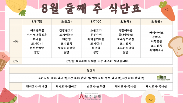 8월 둘째 주 식단표 작성자작성자 황용일 조회조회1,472회 작성일작성일24-08-06 10:36 본문 8월 둘째 주 식단표입니다. 목록목록 이전글8월 셋째 주 식단표 24.08.09 다음글8월 첫째 주 식단표 24.07.25