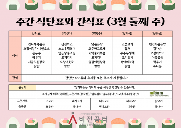 주간 식단표와 간식표(3월 둘째 주)