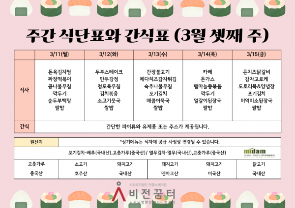 주간 식단표와 간식표(3월 셋째 주)