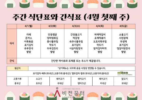 주간 식단표와 간식표(4월 첫째 주)