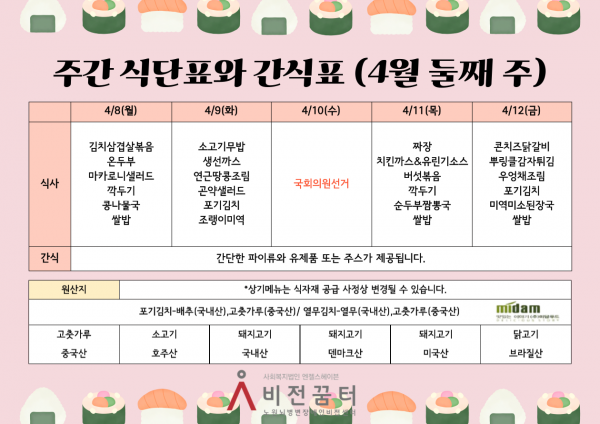 - 다음글주간 식단표와 간식표(4월 첫째 주) 24.03.27