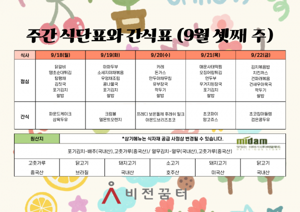 - 다음글주간 식단표와 간식표(9월 둘째 주) 23.09.11