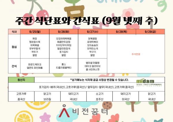 - 다음글주간 식단표와 간식표(9월 셋째 주) 23.09.15