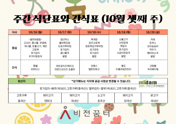 - 다음글주간 식단표와 간식표(10월 둘째 주) 23.10.10