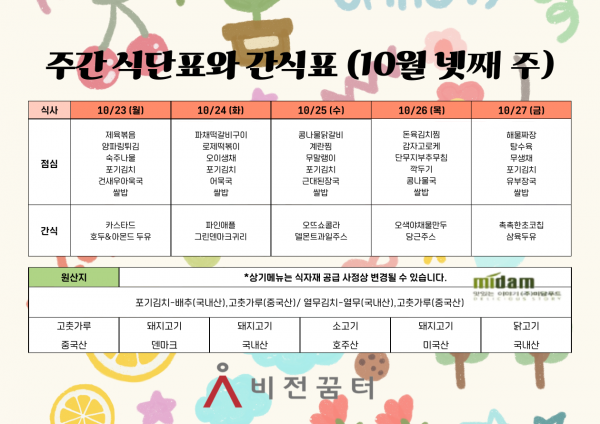 주간 식단표와 간식표(10월 넷째 주)