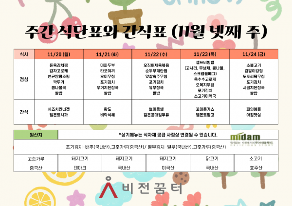주간 식단표와 간식표(11월 넷째 주)