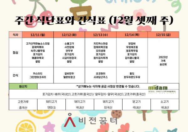 - 다음글주간 식단표와 간식표(12월 둘째 주) 23.12.01